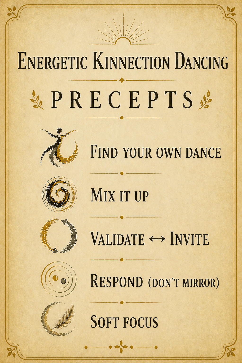 Energetic Kinnection Dancing, a mashup of ecstatic and partner dancing, is an exploration of what emerges at the intersection of structured and unstructured dance, when two or more people attune to each others’ movement, with skill and curiosity. With a few simple tools, a balance is struck between individual flow, and the invitation to co-creation. In this dance, we de-emphasize touch and work directly with the energy between beings, allowing the intelligence of the partnership or collective to take the lead.